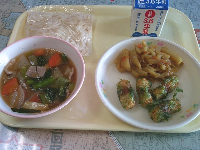 今日の給食は、「あんかけうどん、牛乳、ちくわの磯辺揚げ、じゃが芋のカレーきんぴら」でした。みんなで美味しくいただきました。