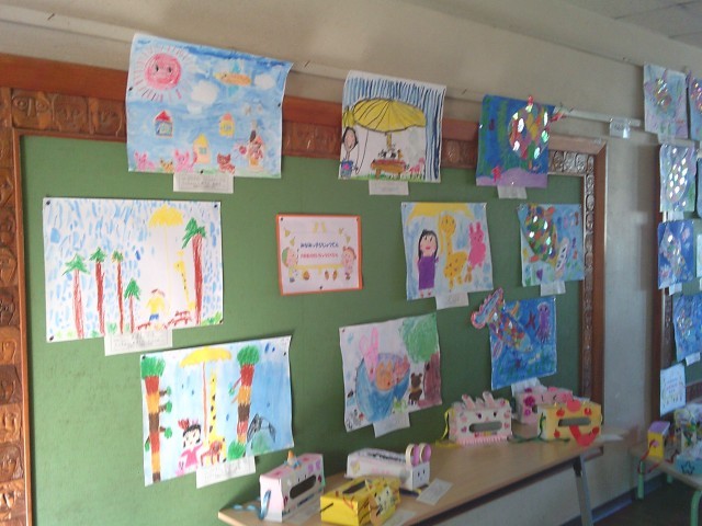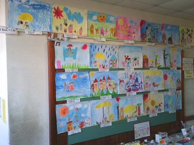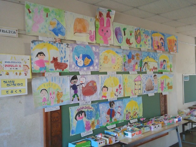 1階中央廊下にて、1年生が「南っ子美術展」を開催しています。題名は「おはなしの絵」で、イメージを膨らませながら活動に取り組みました