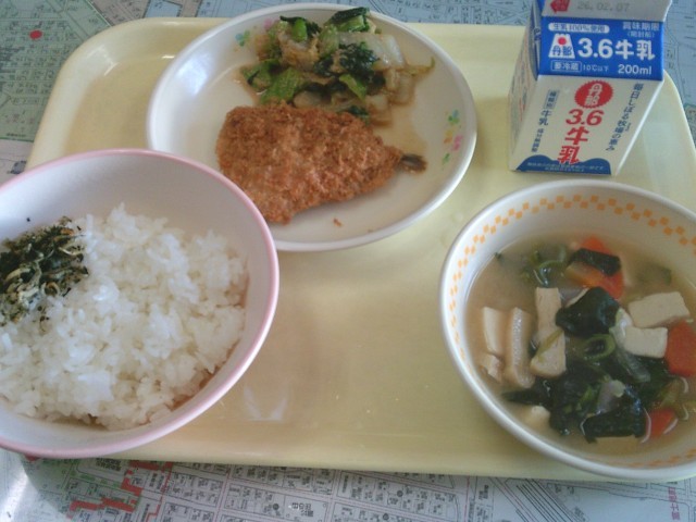 今日の給食は、「ご飯、牛乳、あじフライ、ごま和え、根方白ねぎとほうれん草のみそ汁、お茶わかめふりかけ」でした。今日は6年生が考えた献立でした。みんなで美味しくいただきました。