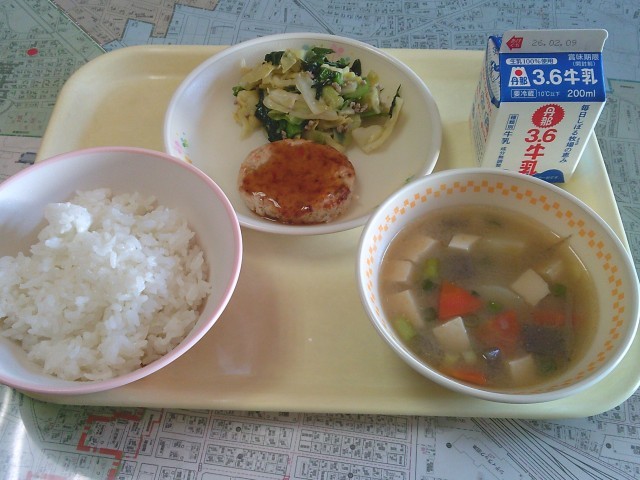 今日の給食は、「ご飯、牛乳、豆腐ハンバーグ、キャベツと小松菜の炒め物、みそけんちん汁」でした。みんなで美味しくいただきました。