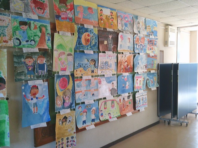 2階中央廊下にて、3年生が「南っ子美術展」を開催しています。それぞれがイメージを膨らませながら色彩画に取り組みました。