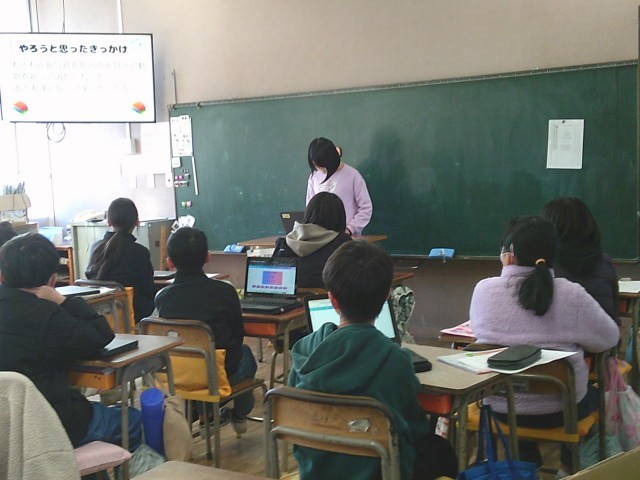 総合的な学習の時間において、「マイプロジェクト学習(個人総合)」を行っていました。自分が興味あるものを個人やグループで探究しています。今日は、発表会に向けたリハーサルをしていました。