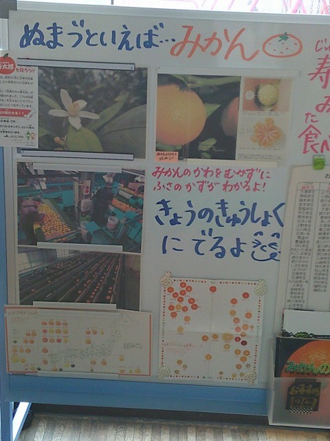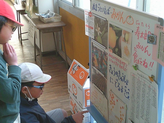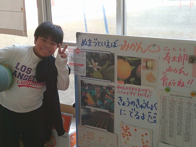 今日の給食には、寿太郎みかんが出ました。このみかんは、JAふじ伊豆様より沼津市内小中学校へ無償提供されました。児童玄関廊下には、栄養士が用意した「沼津といえば『みかん』」という掲示があり、多くの子供たちがそれをじっくりと読んでいました。