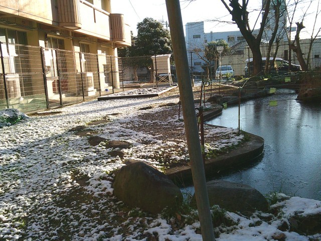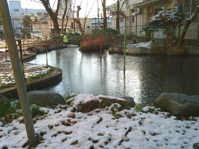 校舎内はあちらこちらに雪が降り積もっていましたが、鯉の住む池も凍っていました。