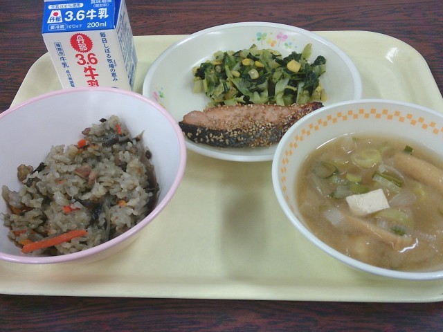 今日の給食は、「五目炊き込みご飯、牛乳、鮭のごま焼き、ほうれん草の炒め物、いも餅と豆腐のみそ汁」でした。今日の給食は6年生が考えた献立でした。
