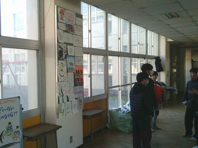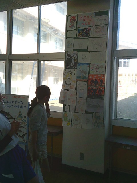 児童玄関付近中央廊下にイラストクラブの作品が展示されています。みんなで作品を見入っていました。