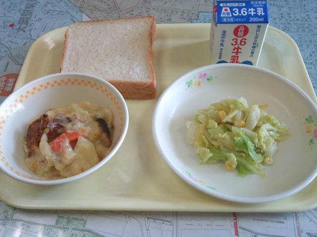 今日の給食は、「食パン、牛乳、鶏肉とポテトのグラタン、キャベツとコーンの炒め物」でした。みんなで美味しくいただきました。