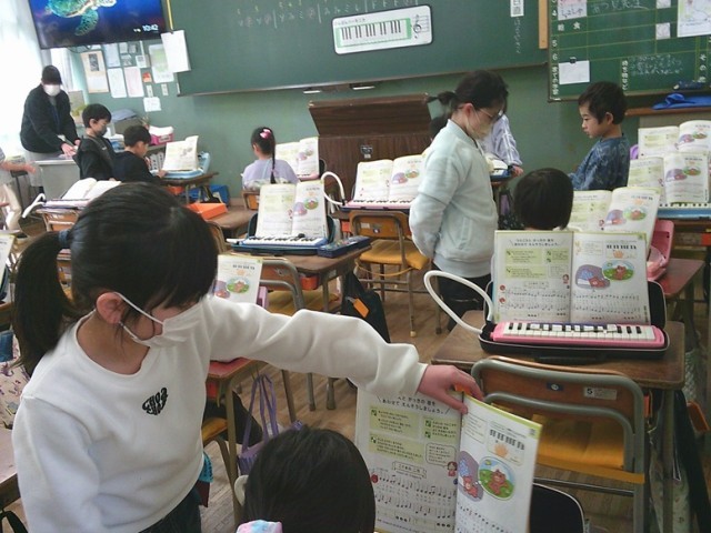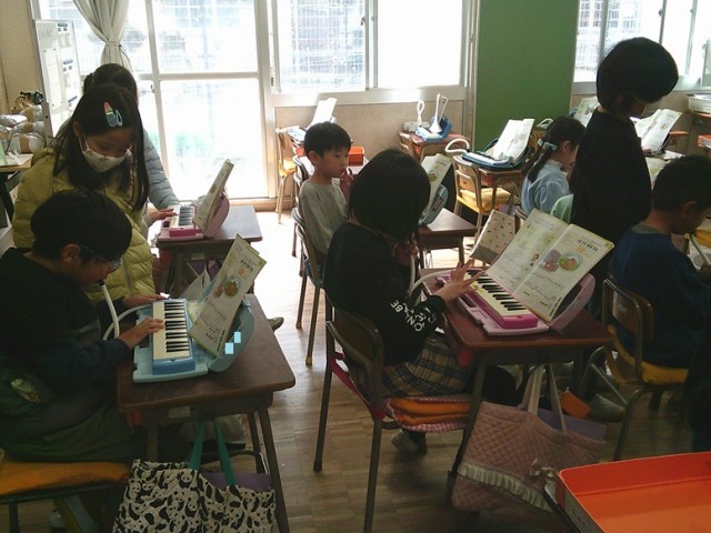 2年生の学習の様子です。3クラスとも友達とペアやグループになって活動をしています。音楽では互いに鍵盤ハーモニカの操作の仕方について教え合いました。