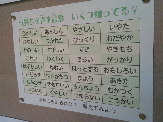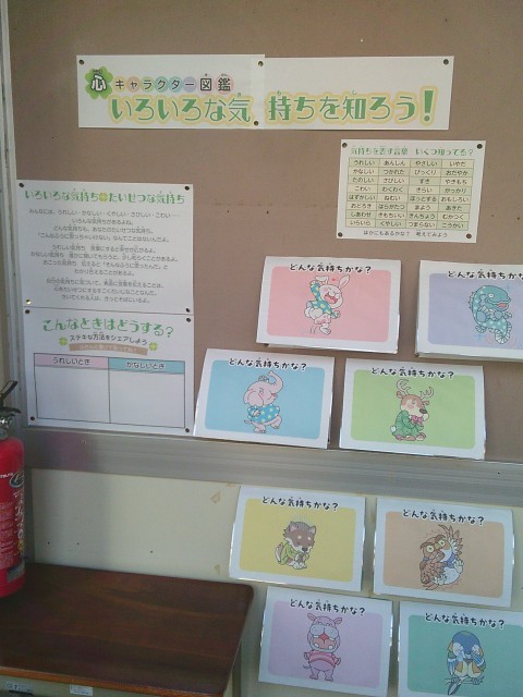 保健室前の掲示が時季に合わせて模様替えされています。今回は「いろいろな気持ちを知ろう!」というテーマで、自分に限らず、周りの友達もいろいろな気持ちをもって生活していることを知ってほしいための掲示です。保健室前を通りかかったら見てくださいね。