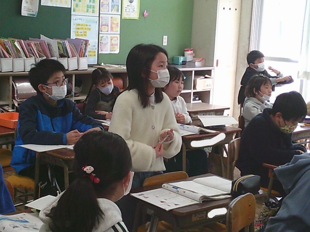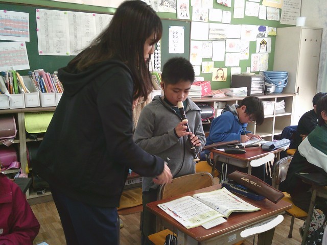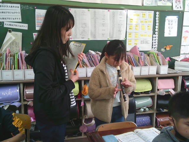 1組は、算数の学習の練習問題に取りくんでいました。2組は、音楽の授業でした。リコーダーのテストも行われていました。