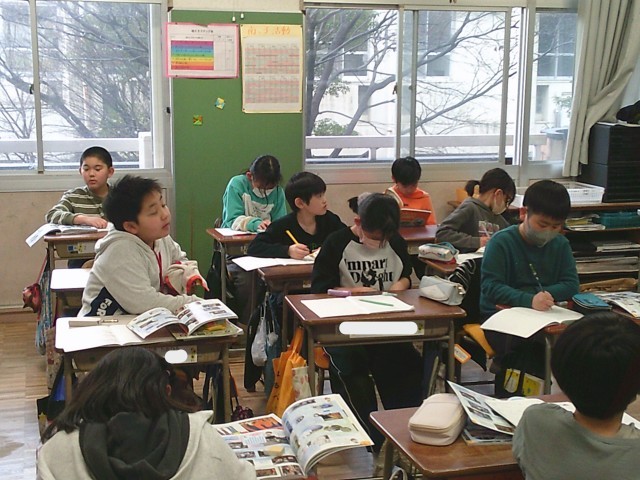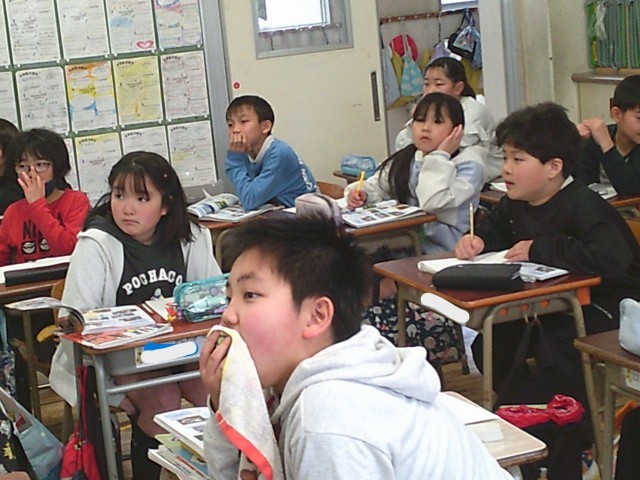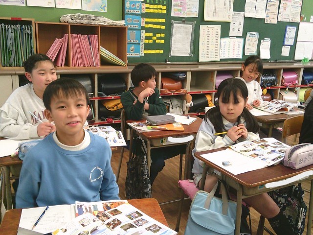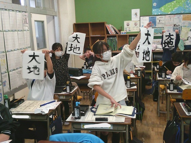 1組は、社会の授業でした。近隣の街、富士宮市について勉強していました。2組は、書写の時間でした。「大地」をみんな力強い字で書いていました。