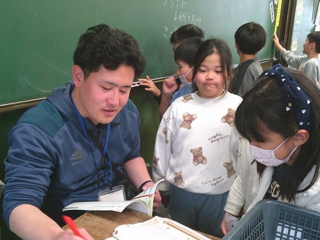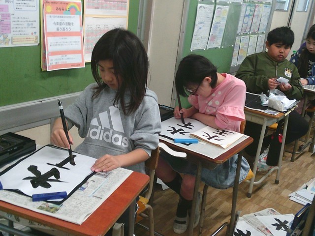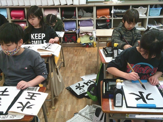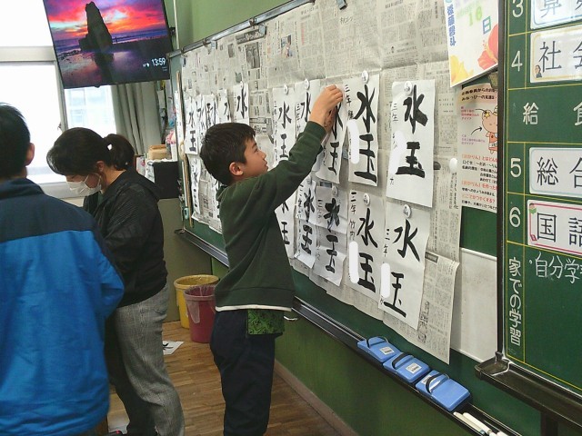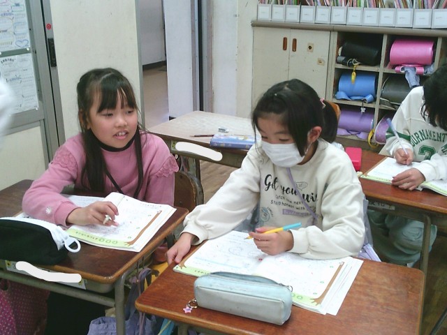 1組は、書写の時間でした。「水玉」の字の清書を仕上げていました。2組は、算数の授業でした。教科書の復習問題を友達と協力したり自分で考えたりしながら一生懸命解いていました。
