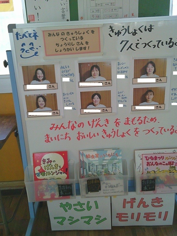 児童玄関廊下に、栄養士が準備した給食室からのお知らせが掲示されています。