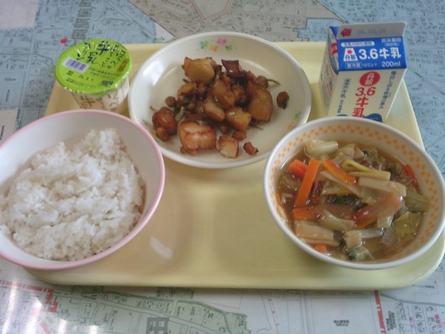 今日の給食は、「ご飯(中華丼)、牛乳、じゃが芋と大豆の揚げ煮、牛乳プリン」でした。みんなで美味しくいただきました。今年度の給食回数は今日を含めてあと11回となりました。