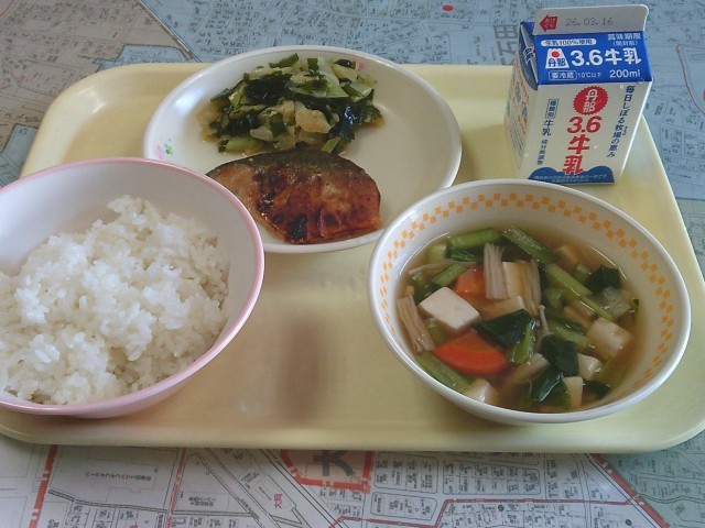 今日の給食は、「ご飯、牛乳、鯖のみそ焼き、わかめ入りおひたし、のっぺい汁」でした。みんなで美味しくいただきました。