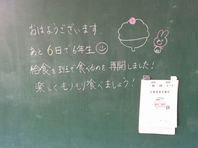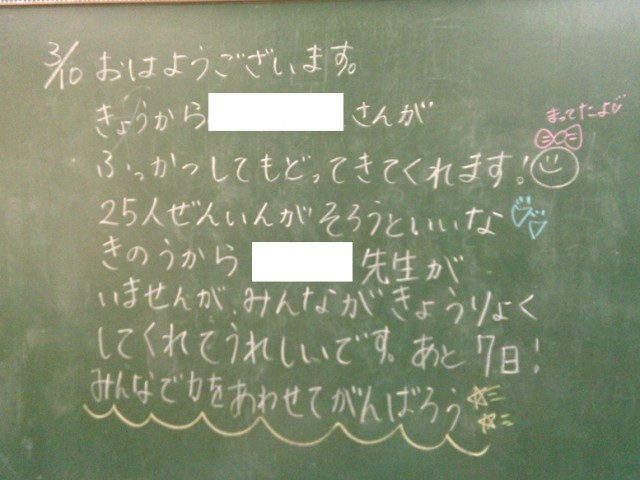 学級担任が黒板メッセージを用意して、子供たちの登校を待ちます。