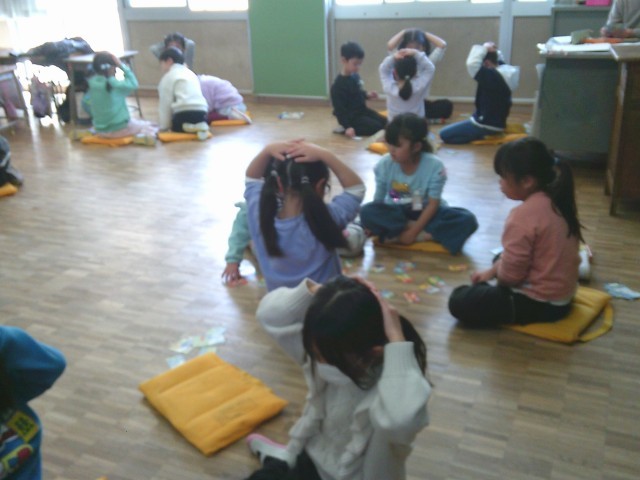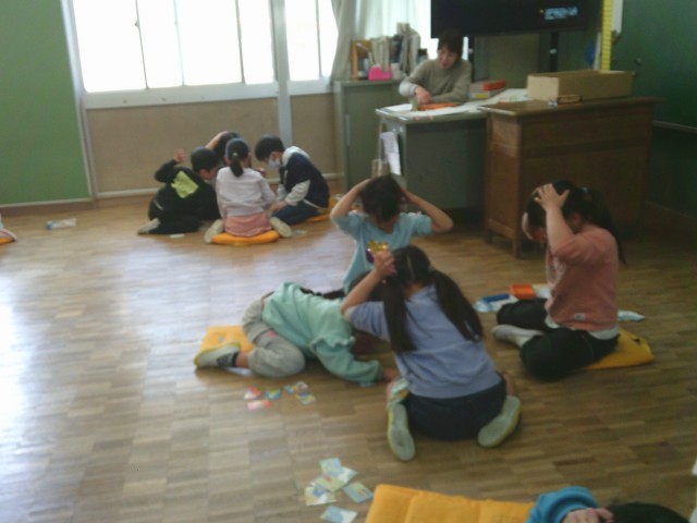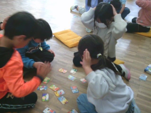 1年生はかるた取りゲームを行っていました。学級担任が読み札を読み、それに合わせて子供たちがかるたを取っていきました。