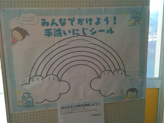 保健委員会では、手洗いの活動を啓蒙していきために、「みんなで かけよう!手洗いにじシール」を用意しました。みんなで手洗いをしていきましょう。