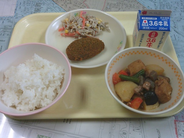 今日の給食は、「ご飯、牛乳、黒はんぺんフライ、ごぼうサラダ、鶏肉と生揚げの煮物」でした。みんなで美味しくいただきました。