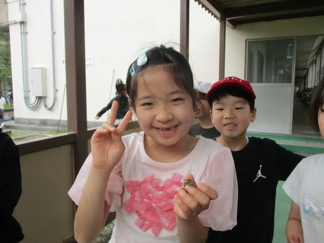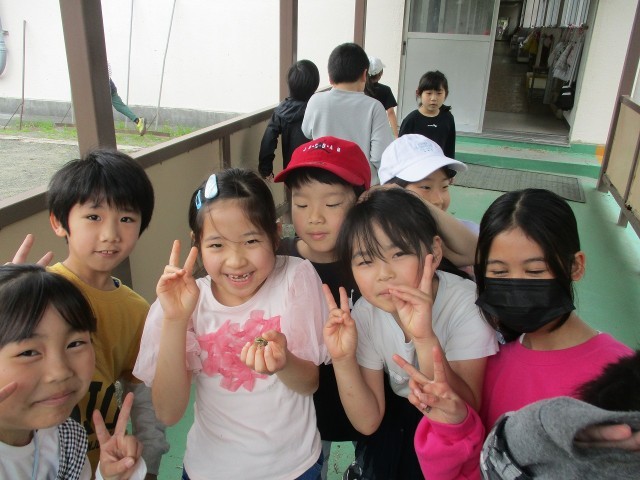 アマガエルを見つけて、みんなでにっこりです!