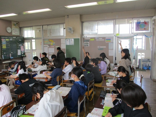 学活では、一人ひとり遠足のめあてを考えた後、実際に出かける場所の写真でイメージを高めていました。