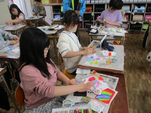 図工では、全芯色鉛筆で塗った上に、クレヨンで塗り、そこをスクラッチすると・・・下の色が浮かび上がってきます。