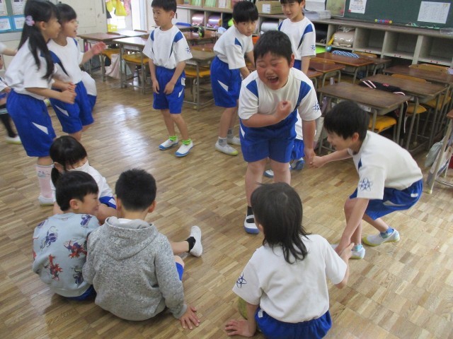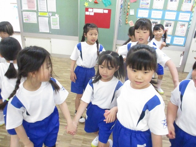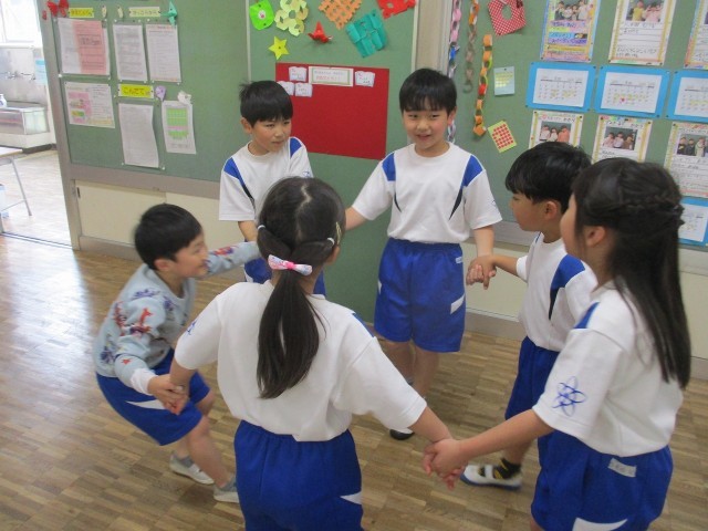 先生がお話した言葉の文字数に合うように、友達と手をつなぎます。