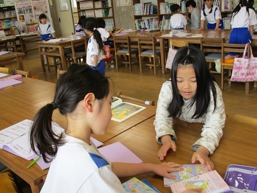 国語の学習では、学校図書館を利用しての活動でした。推薦図書や興味のある本を選んで借りていました。