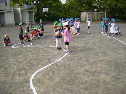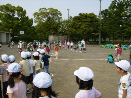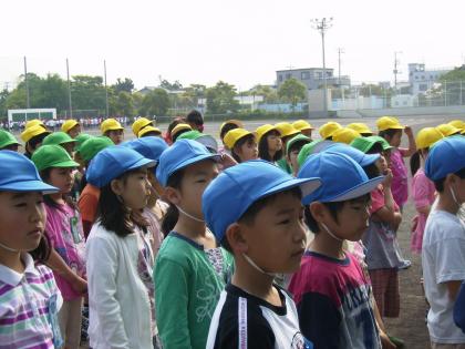 「がくねん しゅうかい・・・って なに?」「どこで やるの?」とわいわい言いながら運動場へ出た1年生。歌を歌ったり、クラス対抗の「へびじゃんけん」をしたりして楽しくすごしました。初めての学年集会は、1組さんが計画してくれました。