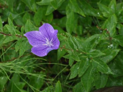梅雨の中、玄関前の花壇に『ききょう』の花が咲いています。紫色で気品がありますね。ぜひ、子どもたちに見てもらいたいです。