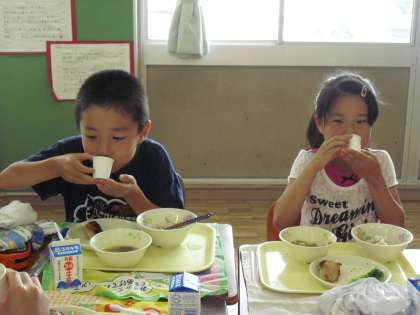 今日は給食の時間に日本茶インストラクターの方に来ていただき、3年生にお茶の歴史や作り方、入れ方を教えていただきました。また、沼津茶飯も試食していただきました。