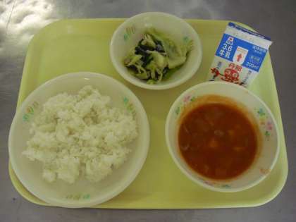 ドブラジーニアはブラジルの料理で、牛の内臓やお豆をいれて煮込んだ料理です。今日の給食では、豚肉、ウインナー、しろいんげん豆をトマト味で煮込んであり、とってもさっぱりした味になっています。ブラジルでは、ドブラジーニアはごはんと一緒に食べるそうなので、今日はカレーの時のように平皿にごはんをいれて、かけて食べてみてください♪