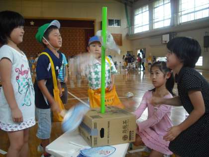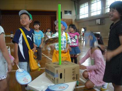うちわを使って、UFOに見立てた紙を飛ばすあそびです。大人も夢中になります。