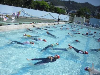 7月8日(月)5時間目に6年生全体で着衣水泳を行いました。着衣状態で浮くことやペットボトルを使って浮くことなどを体験しました。