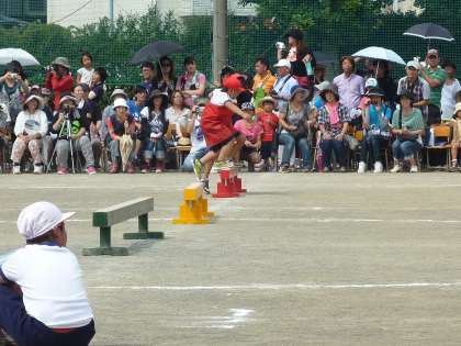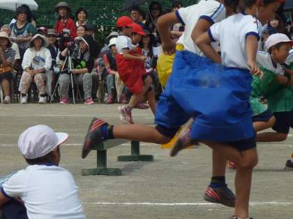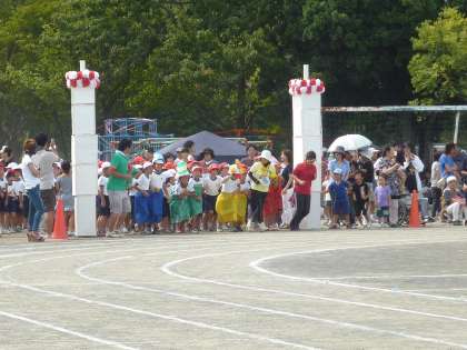 二人で大きなパンツをはいて、スピードとチームワークを競います。