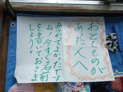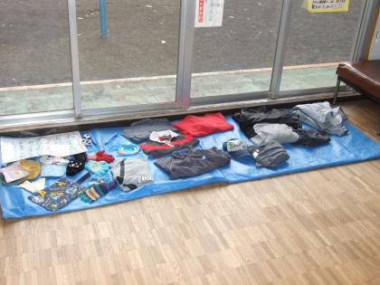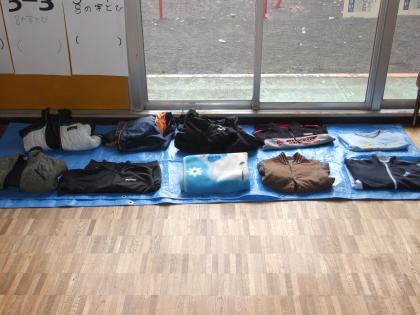1階中央廊下に落とし物を展示しています。上着が数多く届けられています。心当たりのある方は申し出てください。