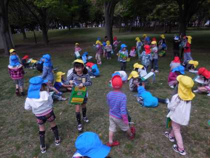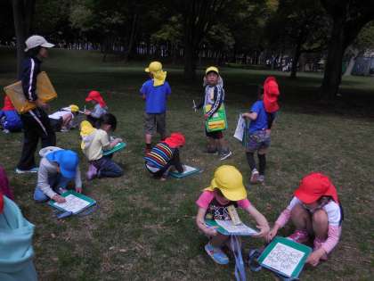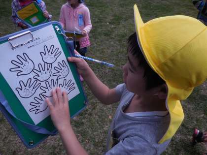 大岡公園で、1年生の全クラスが集まってサイン集めを行いました。