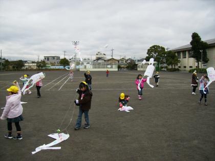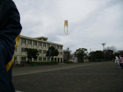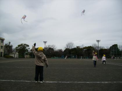 たこができあがり、はりきって外に出ました。少し風があったので、うまくあがりました。