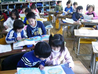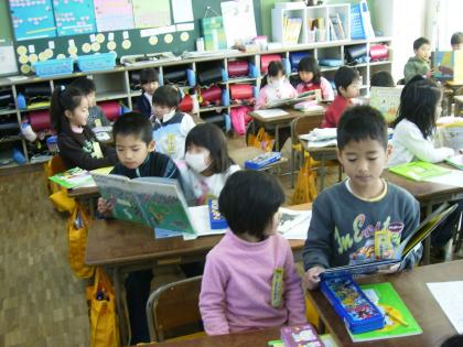 いつもはペアのお兄さんお姉さんに読んでもらっているペア読書ですが、3学期は1年生が本を用意します。すきな本を選んでどきどきわくわくしています。今日は隣の友だちを相手に読み聞かせをしました。
