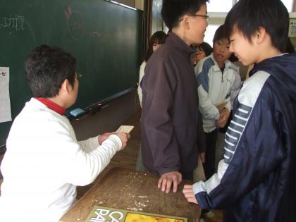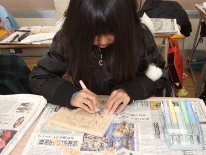 図工で「オルゴール入り木箱」のふたを彫り進めています。