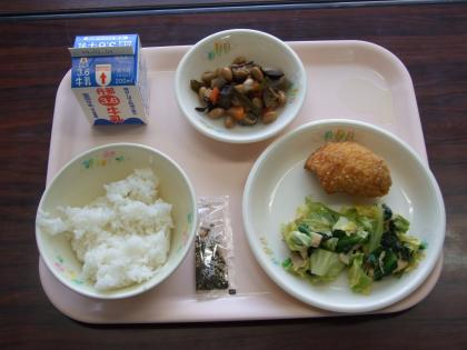 今日のメニュー いかのさらさあげ ベーコンと野菜の炒め物 五目煮豆 ふりかけ