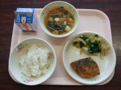 今日のメニュー 鯖のカレー揚げ ごまあえ けんちん汁 ご飯 牛乳