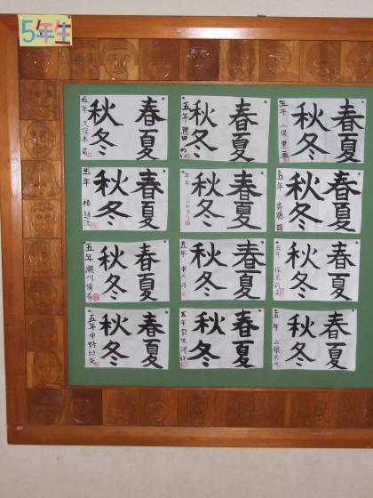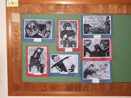 5年生による、習字と版画の作品です。