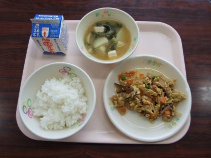 今日のメニュー 親子丼 豆腐とわかめの味噌汁 ご飯 牛乳