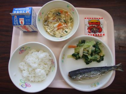 今日のメニュー いわしの丸干し ごまあえ かき玉汁 福豆 ご飯 牛乳