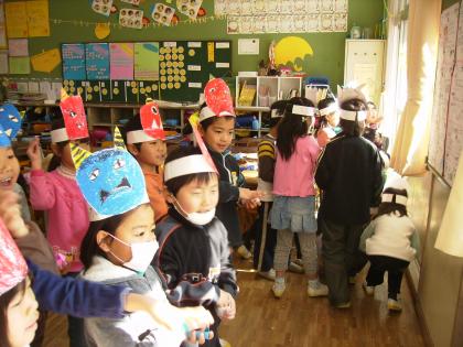 「野菜きらい鬼」「発表しない鬼」「忘れん坊鬼」「泣き虫鬼」・・・心の中の鬼を追い払いました。