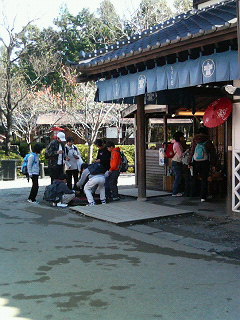 店先で、独楽回しに挑戦、でも、なかなか上手く回りません。