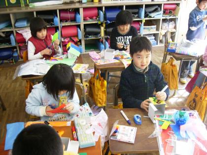 細長いビニール袋やビニールの手袋をストローにつないで、空気でふくらむおもちゃを作っています。