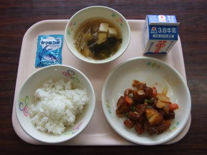 今日のメニュー 豚肉と野菜の甘酢煮 アサリとわかめのスープ ふりかけ ご飯 牛乳