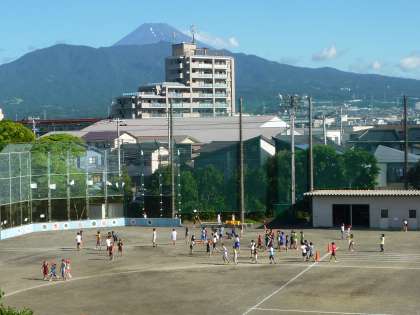 久しぶりの美しい富士山は、根雪の白い部分がよく目立ちます。子どもたちは、朝の始業前から、運動場で元気に遊んだりトレーニングをしたりしています。